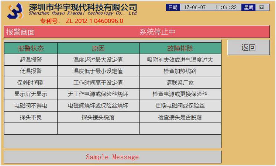 報警畫面:羅列出常見報警的原因以及處理方法。