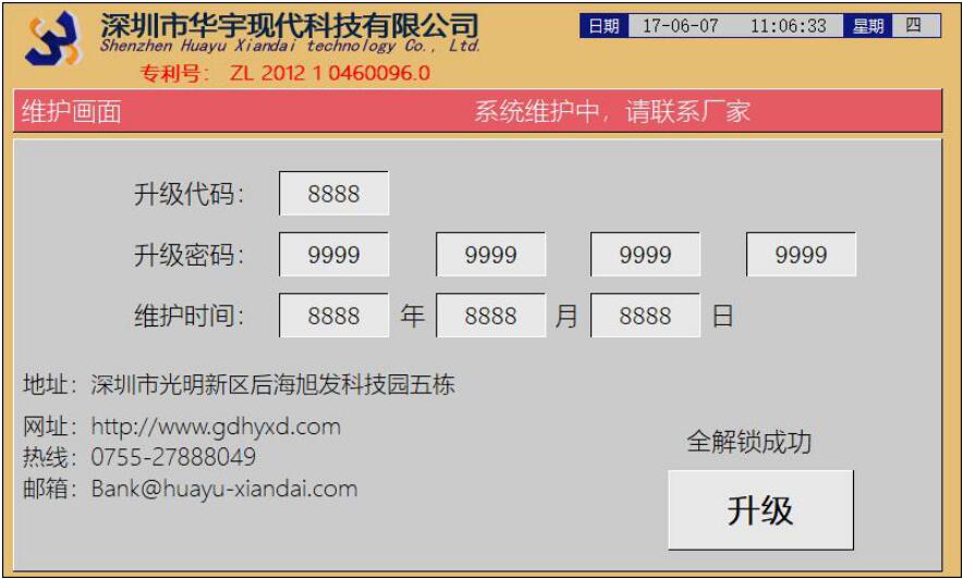 【升級】:客戶在輸入密碼后點擊此按鈕,系統(tǒng)將根據(jù)密碼輸入的值來判定密碼的正確性,并提示是否升級成功。解鎖成功后斷電再上電即可解除本次期限。